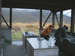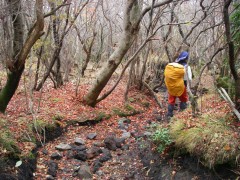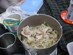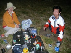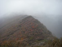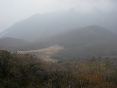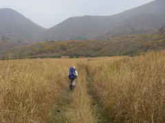 | 前ページからの続き 坊ガツルに着いた我々は夕食の準備となりますが、待ち切れずにまずはビールで乾杯としました。そしてSUMさんが固形燃料のストーブを準備。何とアルミホイルに包んだ料理を3人前準備していたのです。「何にもいらいよ」とこちらで食材は準備していたのですが腕自慢もあってか、山でこんなリッチな料理を味わえるとは思っていませんでした。ワインでも持ってくれば良かったと焼酎を飲みながら思ってしまいました。豚肉と玉ねぎも持ってきたとのことでそれは炒めて、あとはトン汁風鍋で豪華な夕食となり食べ過ぎて焼酎が余ってしまいました。暗くなるのも早く、さすがに夜は冷え早々とテントに入りいびきをかき始めます。しばらくすると雨の音で目が覚めますが再び夢のへ <2日目> 朝5時前には目が覚めましたが、雨が降っているためしばらく様子を見ることに。雨は7時頃には上がり、顔を洗って朝食を済ませゆっくりして9時20分大船山に向け出発します。キャンプ場から避難小屋を見てすぐに登山口の標識があります。紅葉を楽しみながらガスが抜けることを期待して歩き続けます。立中山への入口を見て五合目の標識を見て休憩をしながら進みます。足元が石ころが多くなり急登に喘ぎながら平治岳との分岐の段原に到着です。風が強く、すぐに山頂を目指します。ここからは低木の平らな道を南に向け進みます。避難小屋を過ぎ、上りとなり岩場となりますが、強風のため登頂は諦めます。避難小屋まで戻り、近くで昼食としました。昼食は暖かいカップラーメンです。天気は崩れ気味なのでキャンプ場に戻り、そのまま下山することにしました。天候が良ければ針窪と立中山に立ち寄ろうと考えていたのですが残念です。坊ガツルキャンプ場に着いた私たちはテントを撤収して下山開始です。下山はすがもり経由と考えていましたが予定より遅くなったため雨ケ池経由の来た道を戻ることにしました。SUMさんは予定通り降りると言う事でここで私たちとお別れです。今日は連休の最終日ということもあり、交通渋滞が予測されるため長者原に着いた私たちは早々と帰宅することにしました。予想通り、10号線は大混雑で遠回りですが脇道を回り、混雑を避け無事帰宅しました。SUMさん、また料理お願いします・・・・・・と妻からです。 <最後に> とにかく1週間遅かったと思った紅葉もまだ十分見ごろでした。そして何といってもタラのホイル焼きとビールが最高でした。(法華院温泉に行けばビールも販売しているそうですが)固形燃料のストーブは気に入りました。今度私も購入します。 |