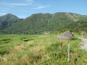 | 昼食を済ませ、 草原を気持ち良く歩く | 三俣山の斜面を見ながら | 川原では子供たちが遊んでいた |