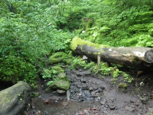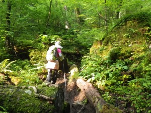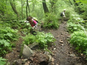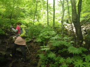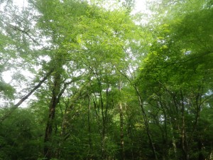 | かくし水に到着ここで朝食(7:02〜7:22) | 新緑が美しい | きつい勾配が続く |