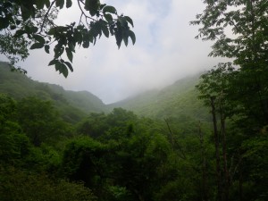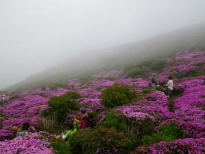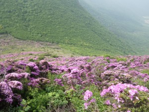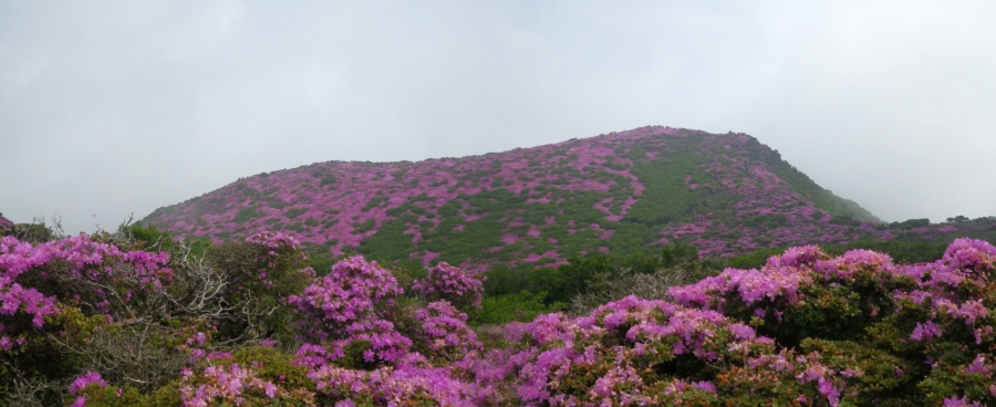 2014年6月8日(日) 天気 晴れ ■出発時間:午前5時30分(筋湯温泉) ■メンバー:家内と私 昨日は猟師山のオオヤマレンゲの花を鑑賞し、温泉宿に泊まった。(前日へ) 心配していた雨は止んでいて、薄い雲が広がる空には、わずかに青い部分が覗いている。 窓を開けると鳥の囀りが賑やかで頬を撫でる冷たい風がとても心地よい。 お世話になった宿と静かに別れを告げ、今日のスタート地点である男池を目指す。 長者原付近から狭い道を抜け、男池に出ると未だ6時過ぎなのに駐車場が満杯で奥の第二駐車場へ。こちらも7割程度埋まっていて私たちが出発する頃にはもう満車状態であった。 確かにさきほど長者原を通過して来たが、そちらも大変な混雑で改めて九重の人気、登山の人気を感じる。 男池の登山口には管理棟があるが、この時間には誰もいない。協力金を入れる箱があるのでコインを2枚いれて入場してすぐに登山届けのBOXがある。 新緑の中、清らかな川のせせらぎに酔いしれるようだが、土の臭いが少々気になる。 バイケソウの群落は、白い花がにゅきにょきと腰の高さまで延びて賑やかである。 平坦な静かな道だが、かくし水まで来ると多くの登山者が休憩していて今見てきたバイケソウの群落のように賑やかである。 私たちは、ここでこの水で珈琲を淹れ朝食とすることに。多くの登山者が、私たちが休憩している間に入れ代わり立ち代りして通り過ぎて行く。これでは平治岳まで渋滞が続きそうだ。 ソババッケまで急登して休もうと思っていたが、またしても多くの登山者が休憩をしていて休む場所もないのでそのまま大戸越(うとんごし)へと進む。 行列ができた登山道は少々ローペースではあるが、立ち止まることなく無事大戸越へと到着。 周りが開けるとガスの中、やや見にくいがミヤマキリシマのピンクの花が斜面に広がっている。 もちろんここもまた多くの登山者で賑わっていた。 立ったまま水分を補給し、平治岳への登りが始まる。行列は、しばらくして岩場の手前から渋滞となり、しばらくの間立ち止まる。 渋滞を抜けると空のガスも抜け、青空が一瞬広がった。しかしそれもつかの間、またまたガスに覆われる。登りきると岩場に多くの登山者が見晴らしを楽しんでいる。平治岳頂上を見るとその斜面はピンクに染まり、歓喜の声は耐えない。次ページへ |