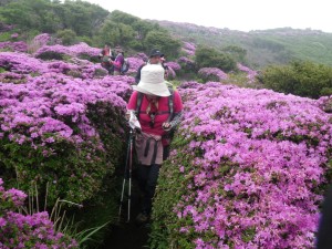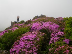 | 眺めを楽しんでいる | 平治岳頂上部 | ミヤマキリシマの間を歩く |