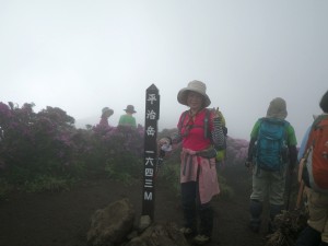 | 平治岳頂上(9:45) | 残念だがガスで視界が悪い | 頂上を振り返りながら降る |