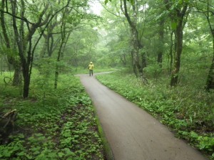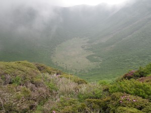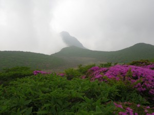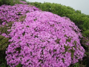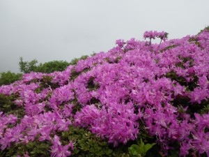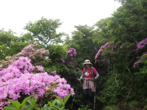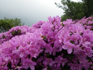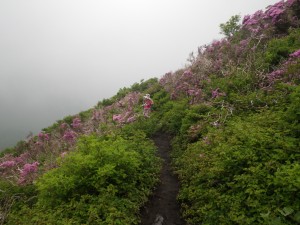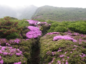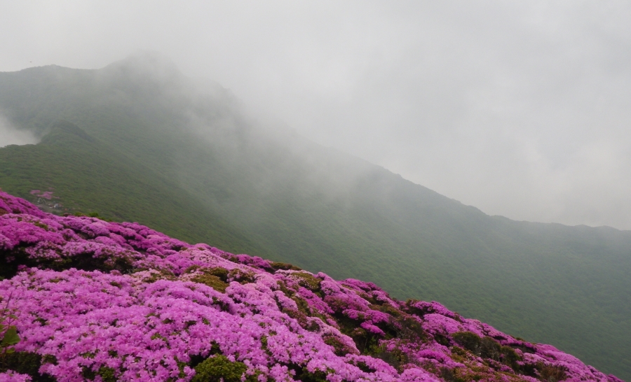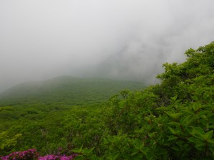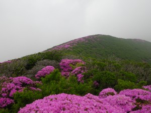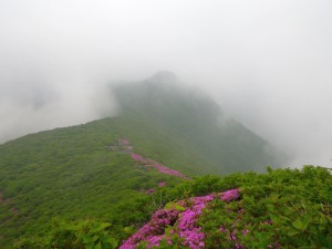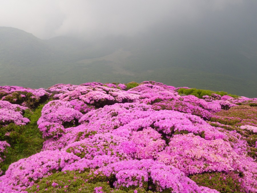 前ページから 平治岳の頂上は登山者で混雑しているが、ガスっていて展望が楽しめないため留まる人は少ないようだ。私たちも記念の一枚を撮るとすぐに下山開始する。 ミヤマキリシマのピンクに染まった斜面を振り返りながらガスがとれることを期待しながら反対から登ってくる人達を優先させながらゆったりと来た道を戻る。 平治岳頂上部が一番見渡せる岩場でしばらく様子を見ていると期待に答えてくれたのか、私のまじないが効いたのか、ガスがなくなりシャッターチャンスを与えてくれた。 大戸越へ下山専用の登山道を降り、そのまますぐに北大船へと取り付く。 この登山道にもオオヤマレンゲがあると聞いて周りを見ながら歩くと北大船までの道程で2株見つけた。しかし、残念ながら未だ蕾であった。 北大船付近のミヤマキリシマの花も素晴らしく自然が造り出した光景のはずであるが、庭師が手入をしたかのように整っている。 北大船頂上では同じルートを辿って来たパーティが食事を摂ろうとしていた。私たちもちょうどスペースが空いたのでここで食事とした。時折、陽が差すとさすがに暑く汗ばむ。さらにカップ麺をすするとさらに汗が吹き出てしまう。ところが、厚くなった雲が空を覆うとすぐに肌寒くなってしまう。 段原から大船山へと行くはずであったが、体力面とガスで覆われていることもあり、諦めて米窪(火口跡)の縁から風穴へと降る事にした。 ミヤマキリシマの花が咲く潅木帯の平坦な道をハイピッチで進む。時々火口を見下ろすが、ガスって何も見えない。風穴へと尾根道を急降下し、鞍部から風穴に着く頃ポツリポツリと雨が落ちてきたので雨具を着る。 石がゴロゴロして歩きにくい登山道を終え、ソババッケ近くになる頃は本格的な雨となり靴の中には水が浸入してきた。 ソババッケからは急に、下山する登山者が増え、再び雨具を着た登山者の行列ができる。 登山口付近に来るとすっかりと雨は止み、川原で泥を落として無事駐車場に。 そこで久しぶりにKENさんやアズキさん、フクロウさんに出会う。何とも偶然の再会である。 しばらく雑談をして帰路に着く。最後に雨に打たれたが、ミヤマキリシマの花を満喫でき最高の山旅であった。今日も山に自然に出会った人に感謝!! ■コースタイム 男池登山口-(25分)-かくし水-(25分)-ソババッケ-(65分)-大戸越-(40分)-平治岳-(30分)-大戸越-(60分)-北大船-(5分)-段原-(75分)-風穴-(70分)-ソババッケ-(60分)-男池登山口※休憩時間含まず。全行程で約9時間かかりました。※歩行距離15.0km高低差866m |