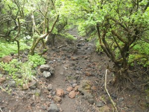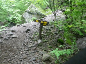 | 大戸越から北大船へと(標識を左) | オオヤマレンゲを見つけたが未だ蕾 | 小石の多い登山道を歩く |