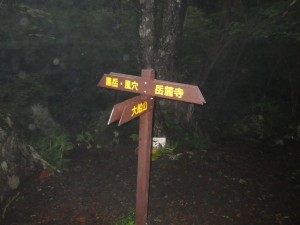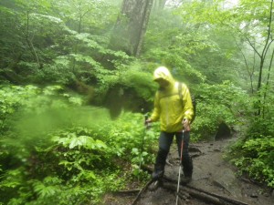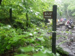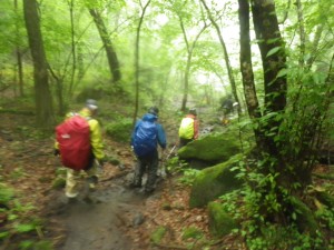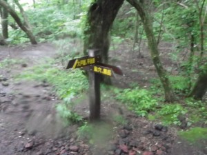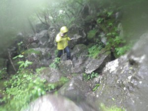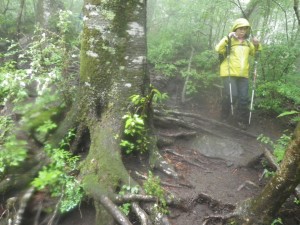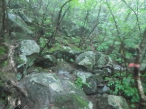 | 黒岳との分岐 風穴付近(13:34) | ごろごろした岩上を歩く | 雨は本降り |