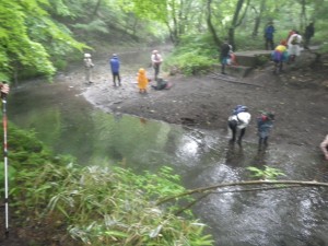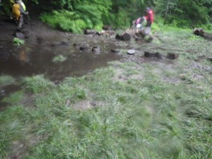 | 登山者の行列 | かくし水通過(15:18) | 川原で泥を落とす(15:40) |