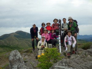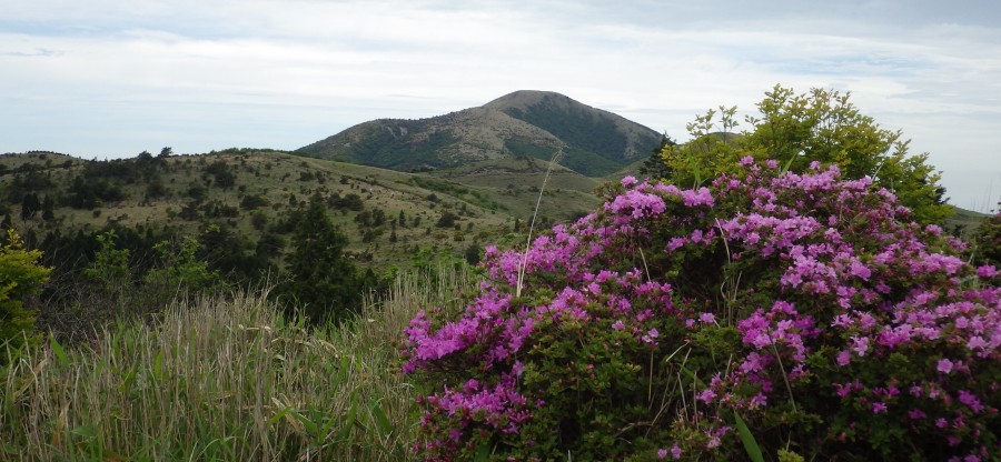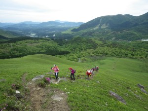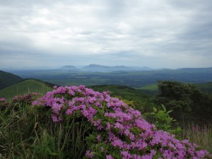 2015年5月24日(日) 天気 曇りのち晴れ ■出発時間:午前6時30分(小倉南区葛原) ■メンバー:男性4名 女性6名 計10名 昨年のアッタック山の会で涌蓋山山行を行ったが、風雨がひどくなり途中で引き返した。今回はそのリベンジでもあるが、当日までの天気予報は雷雨から曇りへと前日の夕方までめまぐるしく変わってハラハラしたが、テルテルボウズを作って祈ったおかげか、メンバーの日頃の行いが良いか、曇り空から青空へと好天した。しかも一目山から涌蓋山の縦走路ではミヤマキリシマが予想外に多く、花も満開で最高の登山となった。 集合場所から東九州道を使い、豊前おこしかけでメンバーを一人ピックアップ。 朝早いが、すでに店は開いており弁当をここで仕入れるメンバーもいた。 ここから八丁原までは下道を走ることに。高速道は大回りするので費用対効果を考えるとどうも気が進まない。八丁原に着くと既に数台の車が停車している。早速準備体操をして出発である。 まずは一目山(ひとめやま)。 名前の由来は、豊後と肥後を結ぶ重要な峠が八丁原であり、この峠道を一目で見下ろすことができるので「一目山」と呼ばれたと聞く。私は「いちもくさん」でも良いかなと思うが・・・・。頂上に立つと九重山群が見渡せるが阿蘇山や根子岳もくっきりと見える。絶景である。ミヤマキリシマも数株あって何とも華やかな頂上になっている。 記念写真を撮って縦走路へと下山する。新緑のトンネルとなっている砂利道を抜けて開けるとミヤマキリシマの花が迎えてくれる。誰かが「ミヤマキリシマ街道」だと言ったが、これがしばらく続く。北にはミソコブシ山、一番奥に涌蓋山ときれいな三角形のピークが見える。涌蓋山は大分県側は玖珠富士、熊本県側からは小国富士と言われるらしい。 緩やかな道から小さなピークを進み、再び鞍部に出るとミソコブシ山のピークを目の前にする。 ミソコブシ山と言う山名も面白い。聞くところによると味噌をこす竹籠(たけかご)を伏せたような形からミソコブシ山と言われたそうである。 ミソコブシ山から広い草原は牧草地であるが今日は牛が見当たらない。糞もないのでもしかして放牧をやめたのかもしれない。川原のような場所から再び笹の道に出てゲートを過ぎ少しだけ樹林帯を抜けると林道に飛び出る。疥癬湯と小国町を結ぶ峠でもある涌蓋越である。標識は左に少し進んだところにあり、そこから北に登山道が延びる。 次ページへ |