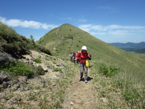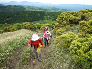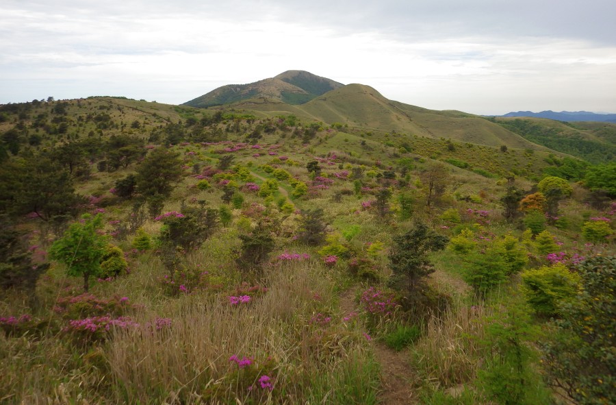 | 前ページより 涌蓋越からは、樹林帯の中をしばらく進む。勾配が急になってくると視界が開け、斜面にはミヤマキリシマのピンクの花が目に入る。 いくら見ても飽きない光景である。. 勾配が増すが、マイヅルソウやアセビの緑や赤の新葉、植木にしたいほどの形の良いカラマツなどを見ていつのまにか女岳に着く。 目の前には遠くに見えていた涌蓋山が今は手の届きそうな位置にある。既に下山してくるパーティやここで昼食しているパーティなどここまで来ると他の登山者が多い。それでも反対側の九重連山と比べると静かな山であるに違いない。 両側が切れ落ちた尾根から石だらけのガレ場を急登し、横長の頂上に着く。北側以外の展望が広がる。空は次第に雲がなくなり目の前に広がるパノラマは輝き始めた。 陽射しは強いが穏やかな風が心地よい。全員、目の前のパノラマを見ながら並んで昼食をする。まるで映画鑑賞のように。 のんびりと昼食を済ませたら集合写真を撮って下山である。下山は往路を戻るが、ミソコブシ山の頂上は踏まず、麓をショートカットする。一目山も麓の舗装道でショートカットし、無事計画通り登山口に着く。全員満足げな顔である。その後、温泉の要望が強かったので八丁原の大高原温泉に立ち寄る。 天気も良く、ミヤマキリシマの花も満喫でき、最高の山行となった。 今日も自然に山に山友に感謝!! ■コースタイム 八丁原登山口-(20分)-一目山-(50分)-ミソコブシ山-(25分)-涌蓋越-(30分)-女岳-(17分)-涌蓋山-(35分)-涌蓋越-(25分)-ミソコブシ山鞍部-(60分)-八丁原登山口 ※休憩時間含まず。全工程で約5.5時間でした. (距離12.2Km 標高差383m) |