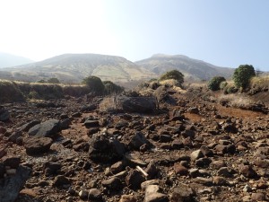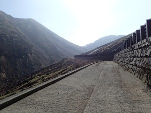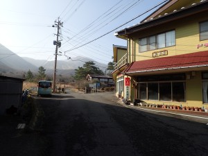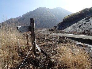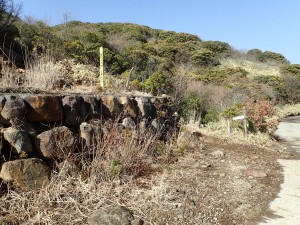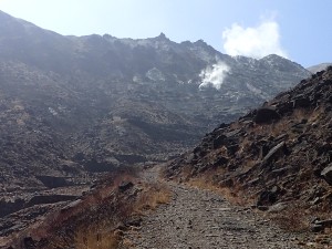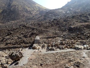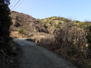 | 舗装道をしばらく歩く | この辺りは上部から落石があるので注意 | この谷を渡る |