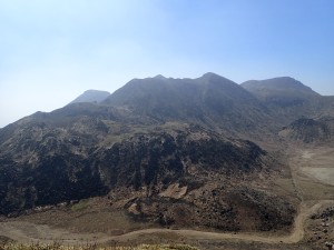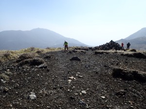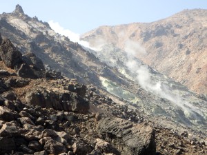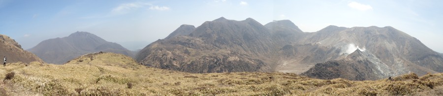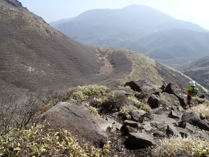 | 荒々しい三俣山 | ガスが吹いている硫黄山 | 岩だらけの谷間を登る |