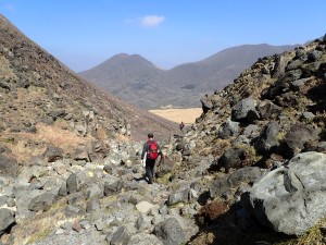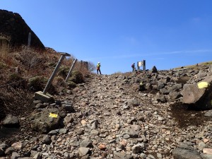 | 登山者が多くなる | ガレ場を通過 | 荒々しい三俣山の斜面 |