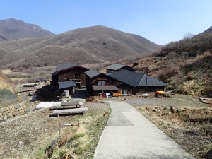 | 灌木帯を通過 | 三俣山を背に | 法華院温泉山荘(14:05) |
