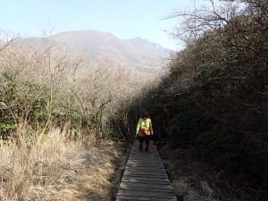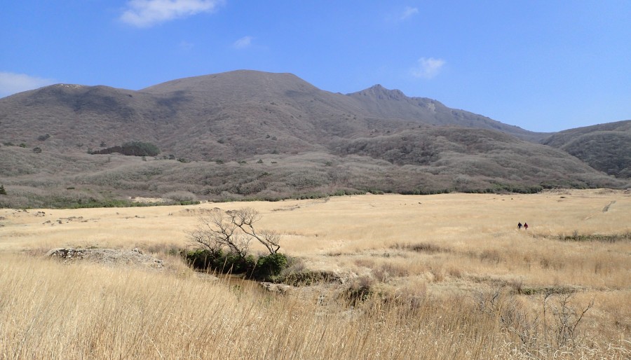 | 前ページから すがもり越から法華院温泉山荘へと北千里浜の砂を踏みながら気持ち良く歩く。 久住分かれの方から続々と登山者が合流する。山荘で宿泊する登山者であろう。 私たちは、山荘が本日の終点ではないので先を急ぐ。 山荘の自販機で炭酸飲料を買って飲む。スカッとしていい気分だ。 目の前には、坊ガツルに平治岳や大船山が裾を広げる。しばらくこのパノラマを見ながらのんびりと歩く。三俣山の麓には、マンサクの黄色い花の塊も目にすることができた。 樹林帯に入ると予想通りあちこちにマンサクが開花している。 足元はぬかるんで歩きにくい。ようやく視界が開けると木道の雨ケ池に出た。 この時期、湿原に花はない。三俣山を見上げるとマンサクがあちこちに咲いている。 再び樹林帯に入る。やっぱりマンサクはところどころにあって楽しませてくれた。 下山する登山者は少なく、入山してくる登山者が多い。もちろんテント泊で荷物は多い。 登山口に近づくにつれ、下山する登山者が増えてきたようだ。 午後4時、無事登山口に着く。家内がホント良く歩いたなぁと感心した。 今日も山に自然に感謝!! ■コースタイム 長者原登山口-(30分)-登山口-(60分)-すがもり越-(50分)-本峰-(20分)-南峰-(15分)-W峰-(27分)-西峰-(20分)-すがもり越-(35分)-法華院温泉山荘-(50分)-雨ケ池-(50分)-長者原登山口※休憩時間含まず。全行程で7時間40分でした。 距離13.9km 高低差729m |