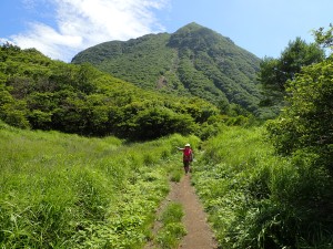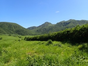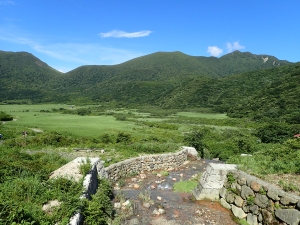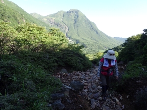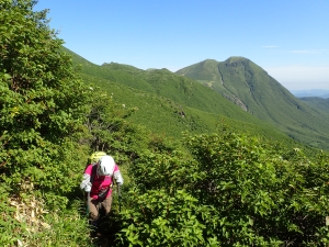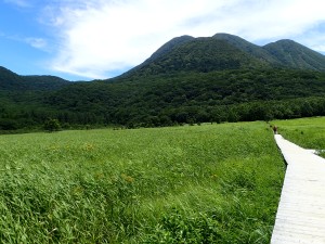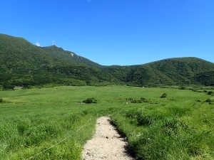 平成28年7月17日(日) 晴れ ■出発時間:10時 自宅 ■メンバー:家内と私 九重は、標高が高いと言ってもやはり暑い。特に陽がまともに当たると暑くてそれだけで体力を消耗してしまう。 それでも青空の下に広がる峰々のパノラマを目にすると来てよかったと思うのである。 今回は昨年のアタック山の会で計画したコースと全く同じだが、前回は風雨で予定を短縮し、コースを変更した。(前回の日記へ) 今回は結果的にそのリベンジとなった。 初日は、長者原から法華院温泉山荘までの行程なので時間に余裕がある。自宅を遅めに出発し、やまなみハイウェイの途中の朝日台レストランで昼食をとり、長者原の駐車場に車を停める。 観光客に混じってダテ原湿原を歩き始める。ノハナショウブがわずかに花を残してくれていた。登山届を記入して吸い込まれるように森の中へ入ると涼しさにほっとする。 もう何度も歩いた道だけど季節によって様子が変わる。 何度も休憩して雨ケ池にようやく到着するが、期待の花は何もない。家内に「毎月来ようか?」と言うと「いい考えねぇ」とかえってきた。確かに毎月来るとそれなりに変化を楽しめるだろう。それほど九重は居心地が良い山だ。 雨ケ池から徐々に下山者と離合すようになる。家内が「いつもと違って逆の立場になれる」と面白がっている。 平坦な道はぬかるんだり、ゴロゴロと石があったり、そして下りとなって石畳の道になると大パノラマは近い。 坊ガツルから扇形に峰々が広がる大パノラマは、青空が一層雄大さを醸し出してくれる。 山荘までの砂利道は、車両が通るため広い。広大な坊ガツルに相応しい道でもある。それにしても静かである。通行人(登山者)は少なく、予想以上に山荘宿泊者も少ないかもしれない。 山荘に着くと今日は50人程度の宿泊だとのこと。北アルプス(日本)の小屋で一つの布団に2人以上で寝るような混雑状況を考えると何とも贅沢なことであろう。 チェックインして、部屋に荷物を置く。まずは「風呂?」いやいやまずは「ビールだ。」といつも気が合わない二人だがこの時ばかりは同意見だった。 ビールを飲んで明日の準備をしてゆっくりと温泉につかり、夕食では同じテーブルで初めてお会いする方たちと山談義、アルコールも入って盛り上がる。普通の旅行ではこんなことはあり得ない。 山歩きの楽しみは人それぞれであるが、こんな山旅も楽しいもんだ。 明日へ・・・・・次ページへ |