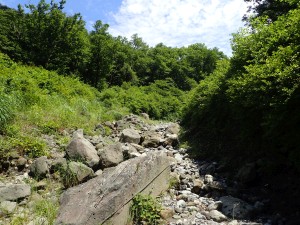| この奥が登山口 | 沢とも言える沼 | コンクリートの作業道を通過 |