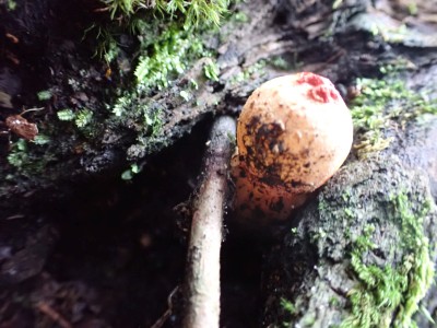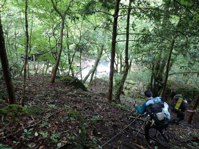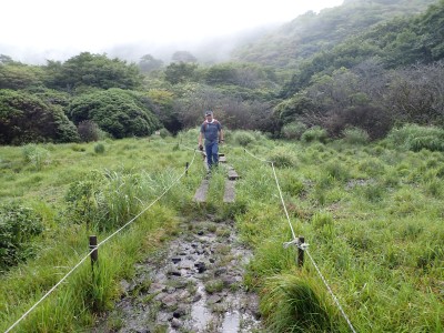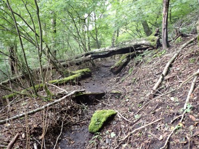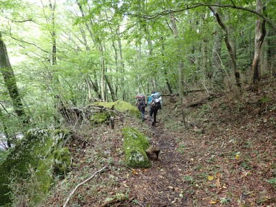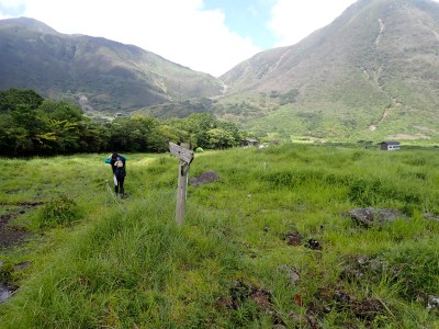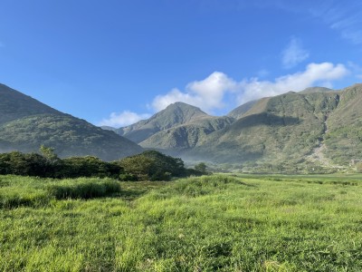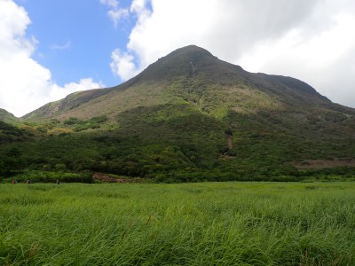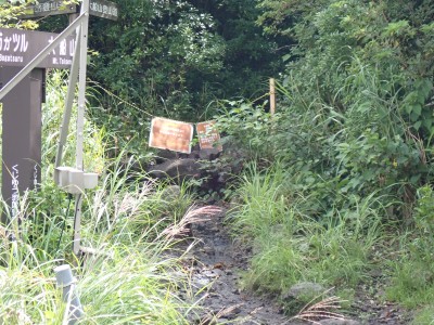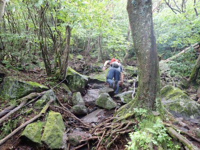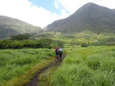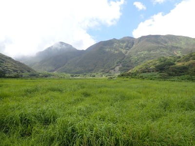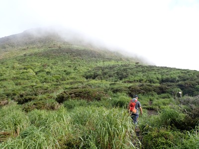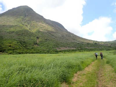 翌日、晴天となったがテントは昨日の雨で濡れている。本来の予定では大船山に登る予定であったが、登山口が通行止めとなっていたので大戸越まで往復することにした。それまでにテントは自然に乾燥してくれるだろう。大戸越までは、しばらくは平坦だが結構きつい急登になる。途中の小さな湿地帯はなかなか雰囲気の良いところだ。カエンタケと言う少々やばいキノコは触らなくて良かった。帰宅して調べたら触っただけで炎症をひき起こすキノコらしい。坊ガツルに戻ったらテントを撤収して重いザックを背負い、下山開始。陽射しが背中に当たるととても暑い。大船林道をしばらく歩き、登山道へと降る。車道が見えるとそこには法華院温泉山荘のオーナが立っていた。聞くとバスを待っているとのこと。今夜、オカリナのコンサートがあるそうだ。私も一度聞いたことがある。無事、駐車場に着いて帰りに炭酸泉の温泉に。そう昔「すがもり小屋」を経営されたいたご主人が山を下りて始めた温泉だ。暑いのに暑い温泉で結局汗は引かないが、ま、さっぱりして帰路につく。眠気が来るので何度も休憩をして無事自宅に着いた。この2日間、山友に感謝、もちろん自然に山に感謝!!