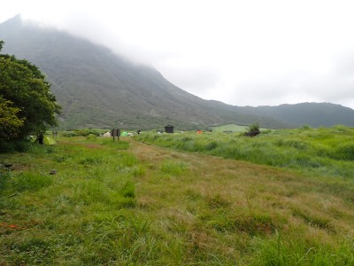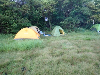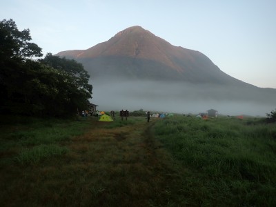 がしんさんのお誘いで九重テント泊山行に参加した。私が当日仕事などで朝から参加できないため夕食に間に合うように段取りをした。待ち合わせは坊ガツル。吉部から歩けば楽のはず。ところが暑さのせいか最初の急登がとにかくきつかった。ザックはテントや寝袋を詰めたが60Lでギリギリ。重さは何キロかは計らなかった。いや重さを知ると挫けてしまうかもしれないので敢えて計らなかった。さて急斜面を何とかクリするとそこからはほぼ平坦な道が続く。暮雨の滝が登山道から見える。かなりの水量だとわかる。汗だくで大船林道との合流点に着く。そして大展望となるのだが、今にも雨が降りそうで三俣山もガスが覆っている。広い砂利道から坊ガツルへ行こうとしたが川の水位が上がっていて渡れず、少し先から入り込む。坊ガツルのテント場に着くとメンバーのテントが張ってあってスペースを空けてくれていたのでそこにテントを設営する。他のメンバーと言っても急遽来れなくなった方もいて私を含めて3人である。その二人は既に立中山を登頂して法華院温泉で入浴するとのこと。私は戻ってくるのを待っていたが、雷が鳴り出し、そして土砂降りに。テントの中で雨が止むのを待つ。一向に戻ってこない二人。これはおかしいぞ、と思い雨が小降りになったところで傘を差し、法華院温泉へ。案の定、既に生ビールは飲み終えていた。何と薄情な・・・・と思いながらも私も参加となる。雨が完全に止んでテントに戻って夕食と同時に再度乾杯!酒宴が始まる。話は弾んだのか床についたのは9時半を過ぎていた。何を話したのかも覚えていないが、寝た時間だけは記憶にある。夜中、時間はわからないが外に出ると星空が広がっていた。