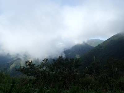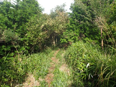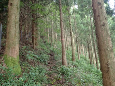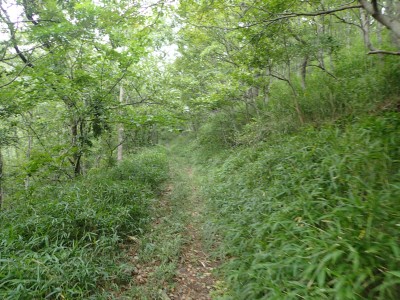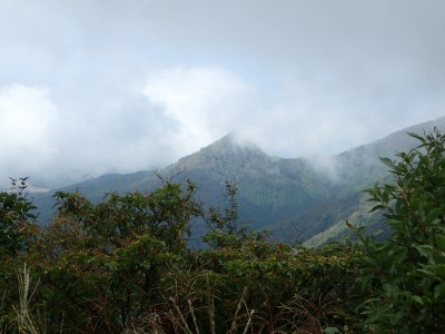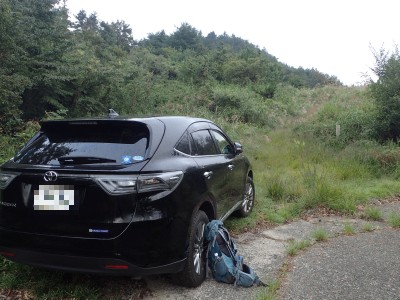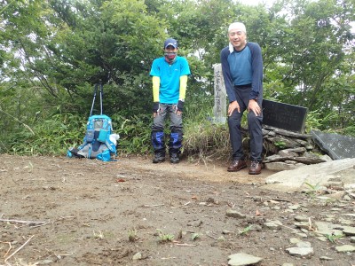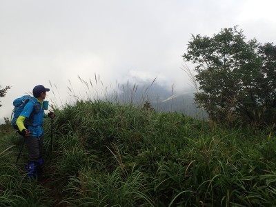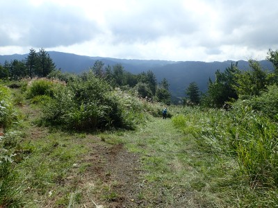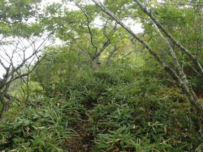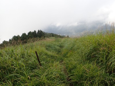 何とか登山口に到着。もちろん他の登山者はいない。ここからしばらく舗装されていない牧野道を歩く。そして杉林の尾根を急登し、灌木帯に出ると景色が広がるはずだが・・・・残念、ガスがかかって視界は悪い。草原の尾根を歩き、山頂へ。山頂は樹林に囲まれているためガスが抜けるのを待つためにながみず山との分岐点まで少し戻る。しばらくガスが無くなるのを待ったが、青い空が見えてきたと思っていたらすぐにガスで隠れてしまう。その繰り返しのため敢えなく下山することに。Y氏が頂上での眺望を楽しみにしていたのでとても残念だ。