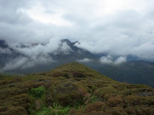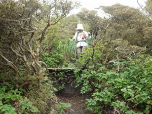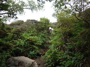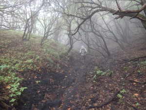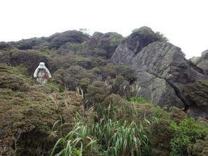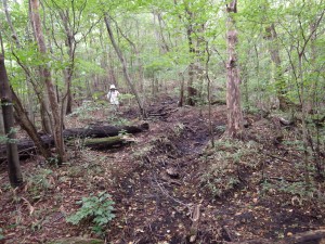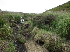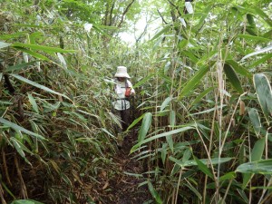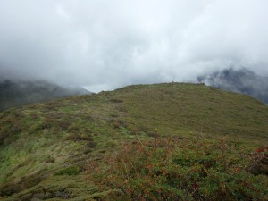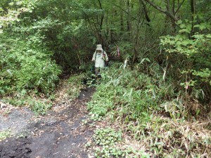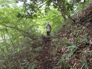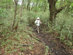 | いくつもの小さな谷間を横断 | 笹の中を歩く | ようやく降り始めた |