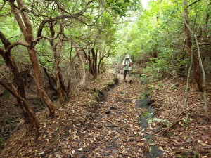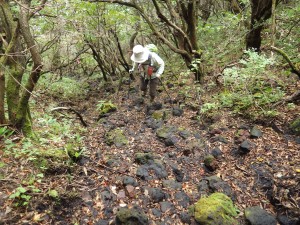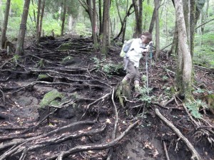 | 杉林の中を歩く | 根っこだらけ | 疲れたね |