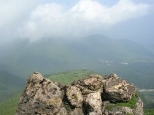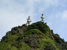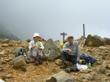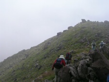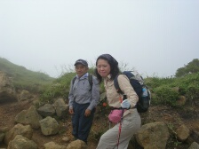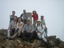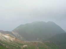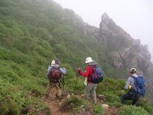2007年9月1日 天気曇り時々晴れ 遊山歩の例会登山は、先週の8月例会に続き、早くも9月例会だ。リーダのMORIさんが担当で星生新道から星生山に登頂することになった。 実はこれまで何度も九重に訪れていながら星生山は初めてである。「いつでも行ける」が結局これまで行けてなかった原因である。今回は大曲近くの比較的新しい道である星生新道を歩くことになった。参加者はMORIさん夫妻、さこちゃん夫妻、シュー左衛門さん、しんでんさん、そして私たち夫婦の8名。もしかして現地にたろうさんが待ってるかも・・・・。集合場所はいつもの豊前おこしかけ、午前6時30分。さぁー出発だ!! <コース詳細> 車は大曲の空き地に停め、牧ノ戸方面へ少し舗装道を歩きます。左手に登山口があります。急斜面が続きます。開けてくると左手に三俣山、振り返ると黒岩山などが見えます。平坦な道となり乳首岩と言われる岩山があります。高いところが好きなメンバーはすかさず登ります。しばらく平坦ですが、再び急登となり溶岩の岩場に出ます。ここからの眺めもなかなかです。さらに上りきると稜線に出ます。今回はガスのため視界が利かず残念です。稜線をしばらく東に向かうと山頂です。山頂から稜線歩きが続きます。土質が他の九重の山々と違っています。北側下方には噴煙をあげて硫黄の匂いが立ち込めています。 南側には久住分かれに向う団体が歩いているのが見えます。稜線は続きやがて岩場となり、東の端側(星生崎)に出ます。下には避難小屋が見えます。急降下すると牧ノ戸からの道との合流点に出ます。避難小屋はすぐです。避難小屋でトイレを済ませ、久住分かれで昼食としました。ここで、妻の膝の調子が悪いので皆と別ルートで下山することになりました。他メンバーはここより北千里浜に下り、諏蛾守越を経て大曲登山口に下山します。私たちは、牧ノ戸へ下り、さこちゃんに牧ノ戸峠まで迎えにきてもらうことにしました。 帰路はお馴染みのコースなので省略します。 次ページ |
