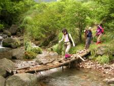 久住山南側の急斜面をどんどん下りますが、かなり急なので気が抜けません。ぬかるところもあります。ロープを頼りにするところもあります。途中開けたところに出ました。西側には扇ケ鼻の断崖絶壁が見事です。九重山を見上げるとその雄大さも感じます。さらに下ると右手に川原が見えてきます。白い硫黄が見えたので温泉が吹いているのかなぁと思い近づいて見ましたが水は冷たく、でも匂いは硫黄の匂いでした。涼しさを味わったらさらに下ります。山頂から約80分で林道に出ます。林道を横断し、何度かその林道を横切って川原に出ます。古い木の橋を恐る恐る渡り、すぐに扇ケ鼻との分岐です。温泉を見て赤川荘の屋根を見て林道に出るとすぐに出発地点の駐車場に到着です。 <温泉> 残念ながら赤川荘は「発電機故障のため入浴できません」とありました。それでここからは離れていますが、名前が面白いのと初めてなので涌蓋山の麓にある「ハゲの湯」に足を運びました。(すみませんYさん、家内が温泉の名前をしつこく聞いて・・・・) <参考コースタイム> 赤川駐車場−(25分)−南登山口分岐点−(120分)−稲星山と九重山の分岐点−(15分)−稲星山山頂−(15分)−稲星山と九重山の分岐点−(25分)−九重山−(80分)−林道−(40分)−赤川駐車場 ※食事や休憩時間は含んでいません。あくまでも参考です。 <感想> 今回は予定コースを端折りましたが、意外とハードでした。全行程で6時間以上かかりました。 途中、川原で遊んだりした時間を除いても6時間です。ガイドや雑誌の歩行時間は割と健脚の人の歩行時間のようです。(私が遅いのかもしれませんが・・・・・) |