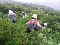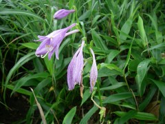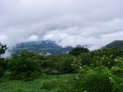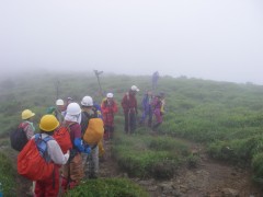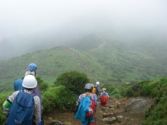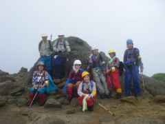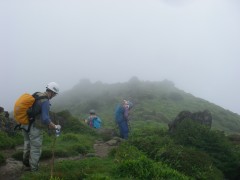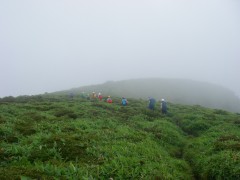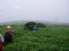 2009年8月9日(日) 天気小雨のち晴れ 8月の「自然観察とボランティアの山の会」の例会登山は、夏の暑さを考え、九重の岩井川岳(いわいごう)と計画していた。今回のコースは偶然にもグリーンウォークでも取り上げられていて登山者も多いと予測できる。通常ならば下見に参加するのだが、その日は体調不良だっため参加できなかった。今回のコースは初めてなので楽しみにして出かけることに。朝起きると残念なことに雨模様である。めげずにバスに乗り、下曽根駅に着く。既に数人集まっていて少し遅れて小倉発のバスが到着。途中、苅田で参加者を乗せ、メタセの森、深耶馬渓でトイレ休憩をして牧ノ戸へ。のんびりコースのメンバーを降ろし、私たちは瀬の本登山口へと移動する。午前10時30分、登山口に着き、体操をして出発。幸い雨は霧雨のようで森の中では、ほとんど濡れずに歩けた。 <コース> 瀬ノ本登山口は、牧ノ戸峠からやまなみハイウエイを瀬ノ本交差点に向い、交差点手前約1KM地点の左手にあります。登山口からしばらくなだらかな勾配の林道歩きが続き、やがて勾配がきつくなるとともに自然林の登山道となってゆきます。アセビの多い林の中、高度を上げてゆくと急に開けて岩井川岳の山頂と思われる峰が見えてきます。再び林の中を歩くが、平坦な道となると草原となり目の前に扇ケ鼻が見えてきてYの字の道の小さな札に岩井川岳と書いてあるのを見落とさず、進路はUターンするように南西に草原を歩きます。広くて平らな草原です。道なりに歩くと山頂標識があります。記念写真を撮ってY字路まで戻り、扇ケ鼻を目指します。草原歩きから再び林の中を急登し、林を抜けると大きな岩がごろごろとした平坦な道となります。たくさんの花々があって和ませてくれます。岩尾根を少し行くと扇ケ鼻山頂です。ここでも記念撮影をして牧ノ戸からの合流地点まで下ります。登山者は急に多くなり、離合にやや手こずります。合流地点に出ると縦走路を横断し、星生山の取り付き地点へと進みます。(途中、草むらで昼食をとりました。)次ページへ |