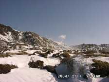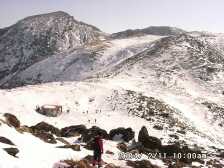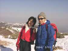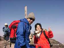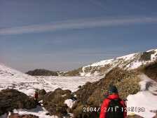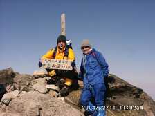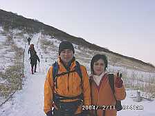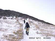 2004/2/11 天気 快晴 −5℃ 今日は雪山ということでベテランのなべさんのエスコートにより九重にやってきました。 朝自宅を5時半に出発し、牧の戸に8時に到着、心配していた道路の積雪はなく、駐車場までノーマルタイヤでこれました。 しかし、駐車場はガチガチに凍っていて、しかも既にほぼ満車、ようやく隅を見つけ駐車することができました。軽アイゼンをつけ、準備しトイレを済ませ8時30分出発です。 牧の戸からは「くつかけ山」までがとにかく急で後は平坦なコースです。樹氷を楽しみにしていましたが、残念ながらこの良すぎる天気で見れませんでした。 しかし、結構雪が深く、別世界を満喫することができました。 今回のコース 牧ノ戸峠−西千里浜−久住分れ−御池−中岳(帰路は往路) コースタイム 牧ノ戸から中岳まで約2時間30分(帰路もほぼ同じ) |