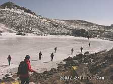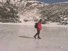 韓国からのツアー客 「アンニョハセヨー」と朝早いのに逆からたくさんの韓国の人たちが下山していました。 いったいどこから来たのだろうと思いましたが、「きっと薄暗いうちに日の出を見に久住山にでも行ったのだろう」とわれわれは考えたのでした。 それにしてもまだ午前9時なのに・・・・・・ ひょっとして韓国の人は足が速いのか・・・・ 御池でスケート 今回の感動はなんと言っても中岳の直下の御池だ 池がガチガチに凍っていて、スケートができますよ 思わず童心に返りますね |