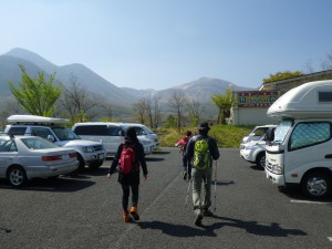 2013年5月5日(日) 天気 晴れ ■出発時間:午前6時30分(自宅) ■メンバー:娘夫婦と家内と私の4名 昨日は娘夫婦と平尾台で足慣らしをしたが、今日は九重まで足を延ばす事にした。 娘は10年ほど前に長者原から北千里浜経由で御池まで一緒に歩いたことがあるが、ほとんど記憶がないようで少々寂しい気がする。 長者原に9時15分頃に着いたが、既に駐車場は満杯状態なのには驚いた。 結構、キャンパーが多いようである。 天候は快晴であるが、黄砂のせいかどうかわからないが、空は霞んでいる。 それでも娘夫婦は広がるパノラマに感動しているようにみえた。 コースは、長者原から諏蛾守(すがもり)、法華院温泉、雨ケ池とちょうど三俣山の麓を一周する初心者コースである。それでも距離はあるので時間は結構かかるであろうと予定していたが、全行程で約6時間だったのでやはり若さなのか、日頃歩いていないでも私たちとそんなにペースが落ちることも無かったようである。 雨ケ池の手前で立ち止まっていたらどこかでみかけたようなお二人が・・・・・ 何とamiさんご夫妻ではないか、記念に写真を互いに撮り、またご一緒できることを約束したが、後でよく考えると連絡先を知らなかった。 『amiさんご主人、今度お会いしたらメールアドレス教えてくださいね。』 さて順調に長者原目指し、降ってゆくが、重い荷物とストックなしのサポータなし(娘夫婦に貸したため)で歩いていたためか、ちょっと膝をねじってしまい、帰宅してからもしばらく痛かった。 油断大敵である。もう若くないのだから無理はできない。 無事下山し、その後、博多経由で帰宅した。やーさすが疲れた。 とにかく今日も山に自然に娘夫婦にもそして山で出会った皆さんに感謝です。 |