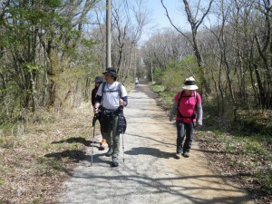 | ミツバツツジが咲いていた | 道路を歩く今日のメンバー | キケマンがたくさん咲いていた |