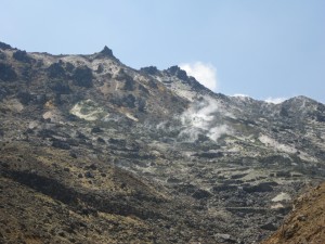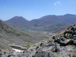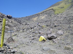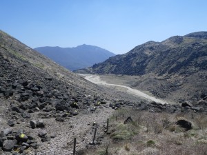 | ここは速やかに進む(落石注意) | 硫黄の山 | 三俣山との鞍部を目指す |