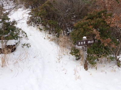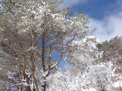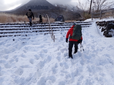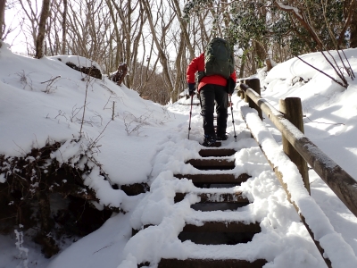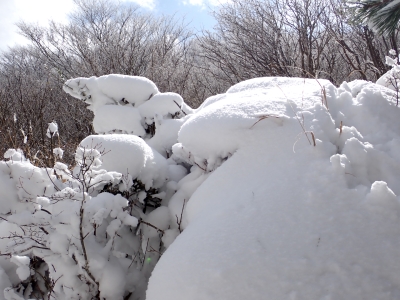 | 斜面の小枝の樹氷が見事 | 雪がある方が歩きやすかった | 石段が埋もれている | |