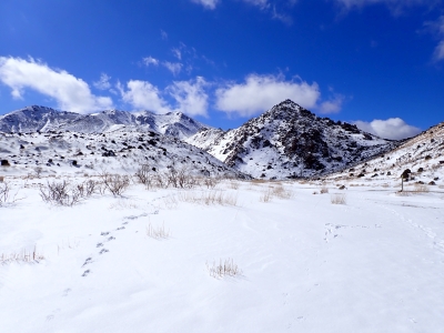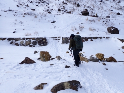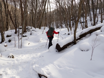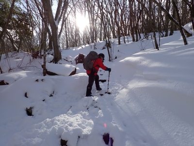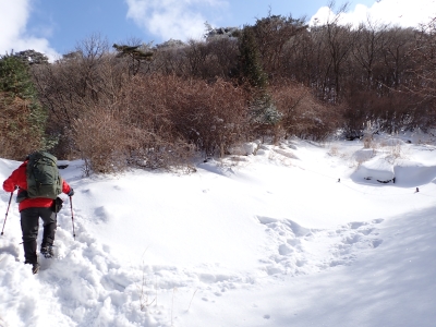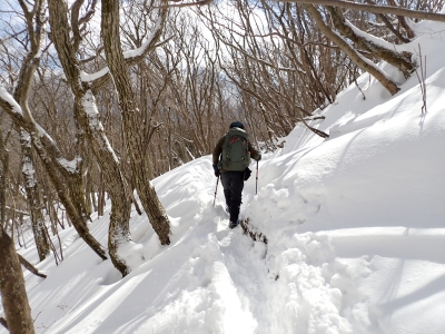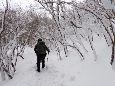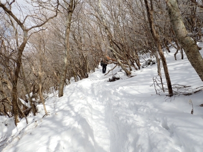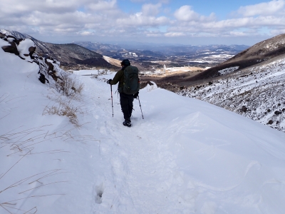 | 絶景を眺めるM氏 | 鹿の足跡もたくさんある | この辺りは雪がある方が歩きやすい | |