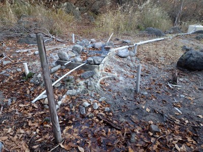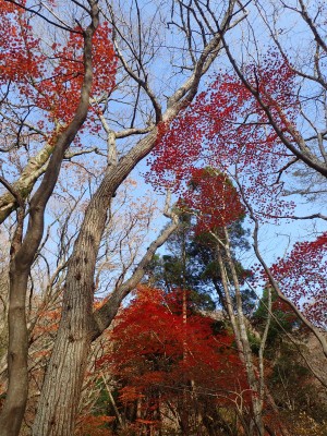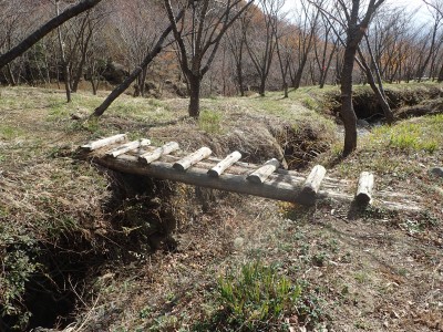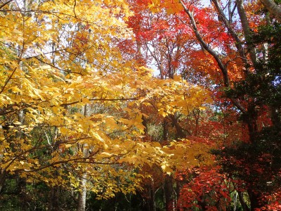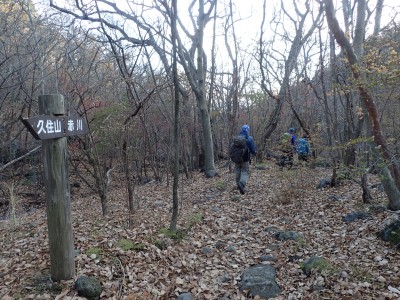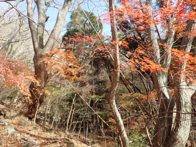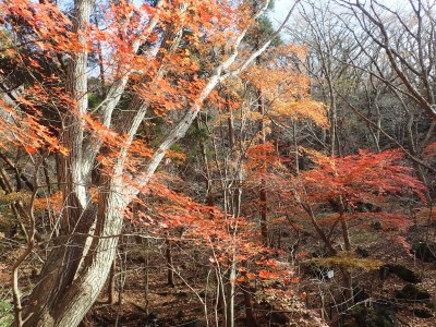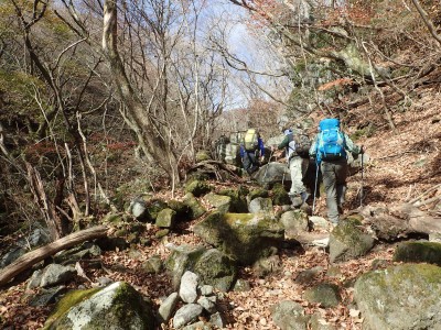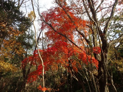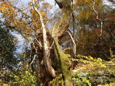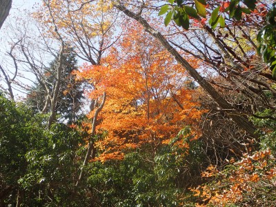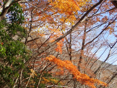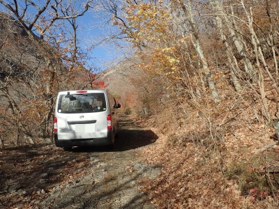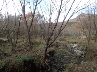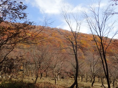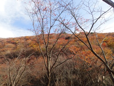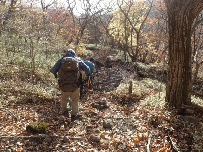 翌朝、南登山口や沢見キャンプ場に立ち寄る。とにかくこの辺りのキャンプは満員御礼のようだ。今日は一番水から佐渡窪まで往復する。登山者用の駐車場に車を停め、いざ出発。水場で水を調達し、くたみ分かれ目指す。いやあ、今日も見事な紅葉が目に映る。山桜が4000本あると言うので開花時期に山の会で訪れる予定だ。さて山桜がある場所は、かなり手が加えられていた。発見されたのは数年前と言うが、本当に自然のものだろうか?ま、どちらにしても開花するときっときれいだろう。くたみ分かれに着くとこらまたびっくり。コンクリートの広い道になっている。「なんで?!」