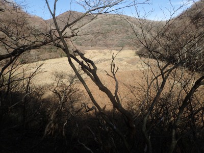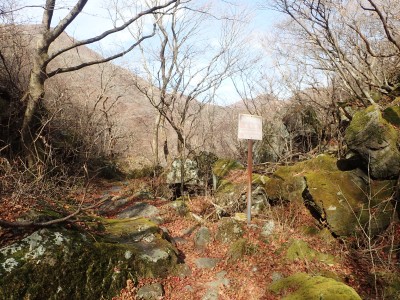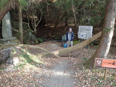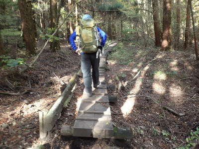 登山道が歩きやすい緩やかな降りなり、林道を横ぎって河原のような樹林帯を抜けると硫黄の匂いがしてきた。温泉はここから引いているんだろう。と前を見ると外国人のカップル、なんでこんな所に?。怖くないのかねぇ・・・。会釈をして木橋を渡るとすぐに扇ケ鼻と分岐に出た。登山口はすぐだ。