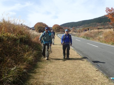 コンクリートの道はすぐに元の登山道に戻り、再び紅葉三昧。鍋割坂を喘ぎながら登り、鍋割峠に無事到着。今回初めてのYさんのために佐渡窪へと降る。木道を終え、ちょうど真ん中辺りに立ち、周りをぐるっと見渡すと何とも心地よい景観だ。山座同定をしたりと眺めを楽しんで往路を戻る。帰路は玖珠のうどん屋さんに立ち寄る。そしてこの時期の耶馬溪の渋滞を予測して高速道を利用して家路についた。この2日間、自然に山に山仲間に感謝!!