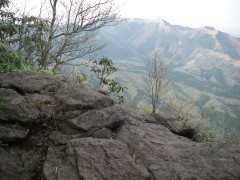 | (前ページからの続き) 登山道は大きな岩場となり稜線は展望が良く由布岳なども望めます。ようやくという感じで前岳に到着です。山頂は北側の展望が得られます。ここからはひたすら下りです。苔むした岩が目に入るようになりシャクナゲも多くなります。岩を歩くので全身を使い穴も多いので注意です。岩壁の際を歩いたりしてシャクナゲの花を楽しみます。ぐんぐんと高度を下げ、途中見晴らしの良い岩の上に立つと花牟礼山などが見えます。いつのまにか岩の道から土の登山道となり、白水荘と黒岳荘の分岐である白水分かれに出ます。今回は白水荘に車を回してもらっていましたので左に進みます。新緑の中、気持ちの良い歩きやすい道を降ると白水荘に出ます。無事下山です。 <今回のコースタイム> 男池登山口-(30分)-かくし水-(30分)-ソババッケ-(45分)-奥ゼリ-(30分)-風穴-(70分)-天狗分岐-(20分)-高塚山-(120分)-上台うつし-(40分)-前岳-(90分)-白水分かれ-(20分)-白水荘P ※全行程で約9時間のロングランでした。今回はかなりゆっくりしたペースでしたので健脚の人であれば7時間から8時間ではないでしょうか。ただ、高塚山からが長いので時間には余裕をもつべきでしょう。 <感想> このコースはガイドブックにもあるのですが、高塚山から白水鉱泉への道は険しく、迷う可能性もあるので初心者のみの山行は危険だと感じました。以前、黒岳荘から逆コースで高塚山を目指しましたが、前岳までがかなりきつかった記憶があります。その時は秋で紅葉が素晴らしく、同じルートでも季節が違えば楽しいものです。 |