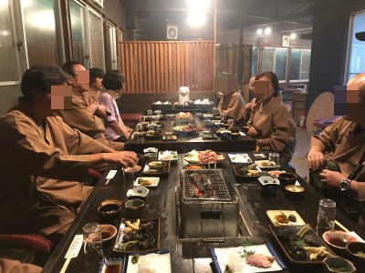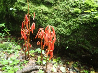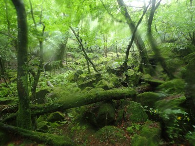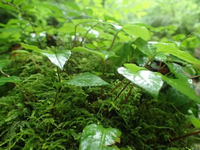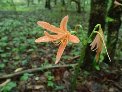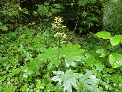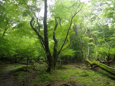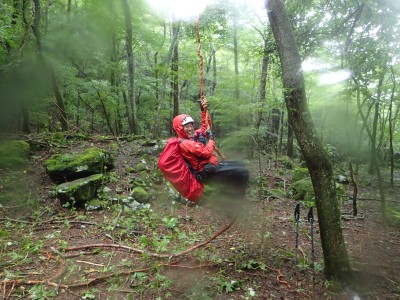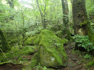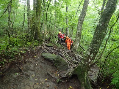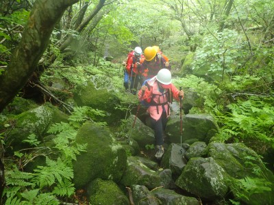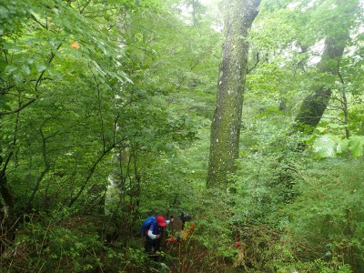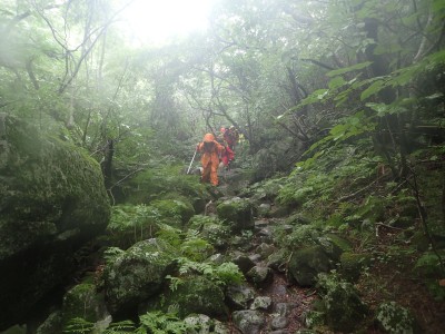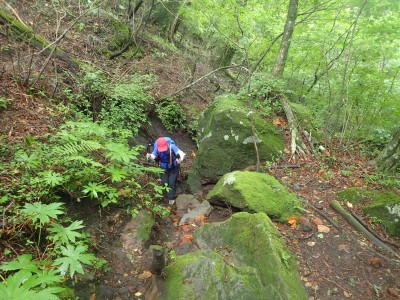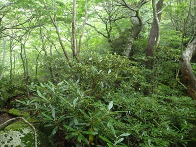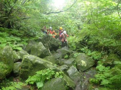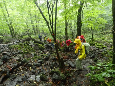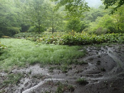 さて、男池の登山口から入山するが、すぐにキツネノカミソリが群生している。何度も来ているのに初めて見る光景だ。そしていつもなら水が溜まることがない沼は池になっていた。かくし水手前で他のグループが下山してきた。当会メンバーの知り合いがいたようでやはり北九州からのようだ。「物好きだなあ」とまたしても自分たちのことを棚に上げて・・・・・。話を聞くとかくし水まで行って戻って来たとのこと。これから散策をしてバーベーキューだそうだ。ソババッケが、どうなっているか、泳いで渡るほど水があるのか・・・などと想像を膨らますが、実際には水は溜まっていない、ただ、ぬかるむ。靴もズボンも泥だらけだ。シャクナゲの多い原生林の中を歩く、緑がきれいだ。岩が滑る。慎重な進行は、普通の倍近く時間を要する。ようやく風穴の近くまで来た。ここで雨粒と一緒に昼食だ。そしてここで引き返すことを決断する。男池に無事下山し、黒嶽荘へ、ずぶ濡れになったので風呂が有り難い。3〜4人ずつしか入れないが良いお湯だ。何しろ炭酸水だ。部屋ではビールで乾杯!夕食は地鶏の炭火焼きと山菜やエノハ(ヤマメ・アマゴ)の塩焼きとご馳走だ。夕食後は部屋で二次会。楽しい夜を過ごした。