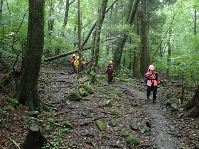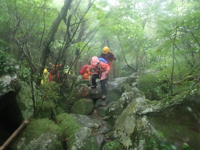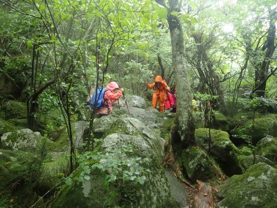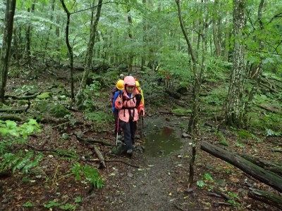 降水確率100%の予報、それでもよほどのことがない限り、中止にしないのが当山の会の方針だ。と言ってもやはり安全第一なので危険なルートや無理なことはできない。今回は、男池からスタートし、ソババッケ、風穴を経由し、黒岳最高峰の高塚山を登頂した後、風穴に戻り、黒岳の裾野を反時計回りに進んで白水鉱泉(しろみず)の黒嶽荘をにゴールするという計画であった。しかし、雨は強まるばかりでぬかるむ道、滑る岩場と歩行時間は極端に遅くなる。そのため予定していたルートは、時間的にも体力的にも無理と判断し、風穴で折り返すことにした。初めて歩く道を期待していたメンバーには申し訳ないが、やはり安全第一だ。それでもメンバー全員、夜の楽しみがあることもあって愚痴る人も出ず、雨を思う存分楽しんでいた。さすが、長年歩いてきた仲間だ。皆、協力的で頼もしい。