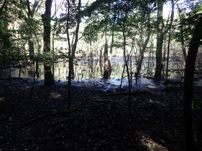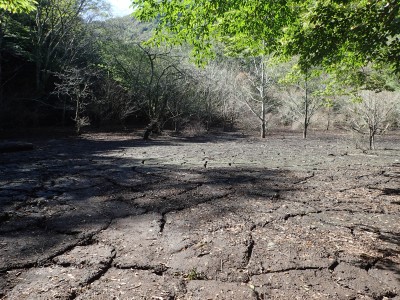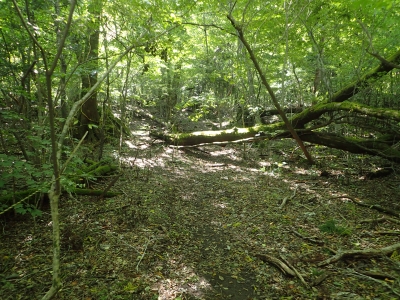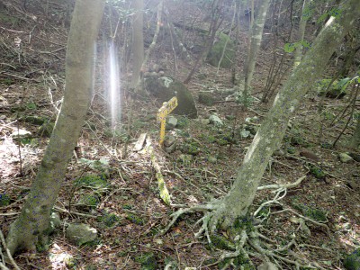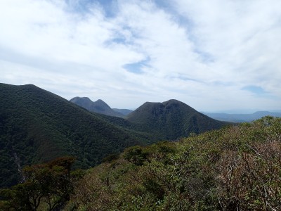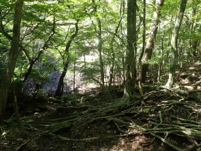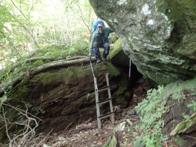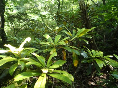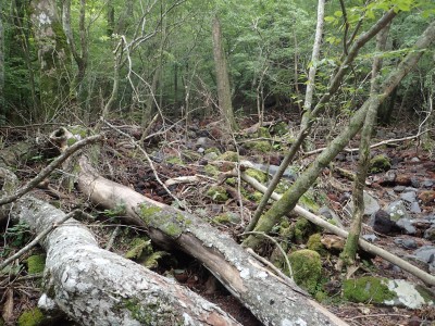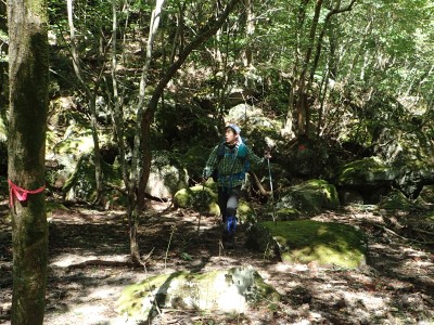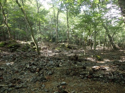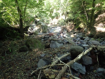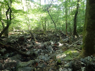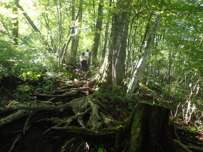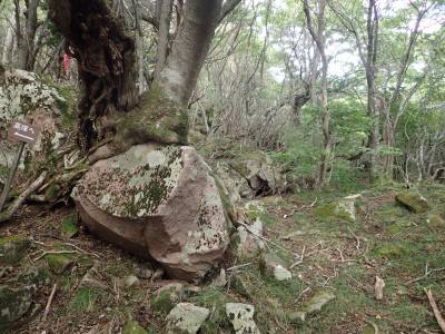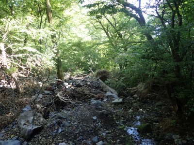 変わってしまった谷間から尾根に取り付くと以前の登山道になりホッとする。ソババッケに着くとここもずいぶんと違っていた。昨年までは、草が生えて水が溜まると渡れないため木の切り株が並べてあった。ところがそれが全く見当たらない。きっと水と泥が周りから流れ込んだのでないだろうか。休憩場所にもってこいの場所だったが、今は座るところもない状態だ。ソババッケを後に、なんとなく今までと違った登山道を風穴に向かって進む。途中、大船山の支尾根の間の谷間を通過するたびに土石流の跡や崩落して流木が積み上がった場所などを目にする。そして奥ゼリの大戸越分岐で一組の登山者に出合う。どうやらソババッケから平治岳に行こうとしたが、道を間違ったようでここまで来てしまったとのこと。年配の方は孫と息子さんを連れての登山のようだが、地図とコンパスもないと言うので平治岳(ひいじ)は諦めて風穴までを往復したらと提案した。大戸越までの道程は危険と知らされてなかったようだ。