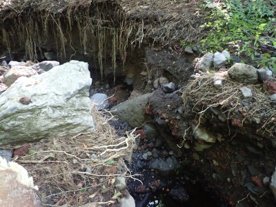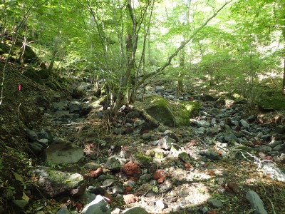 登山道に入り平坦な道を進む。沼を右手に見てしばらくすると「ん?おかしい、道がなくなっている。テープを見ながら進む。石コロが積み上がったり、大きく抉れたりと以前の登山道はなくなってしまっていた。もちろん歩きにくい。少しでも歩きやすいところを見つけ、いつのまにか「かくし水」に到着。手前にあった柵はL字型の支柱が1本残っているだけで無残にも土石流で押し流されたようだ。それにしてはかくし水が無事だったのは奇跡のようだ。