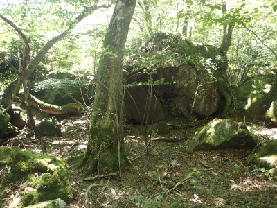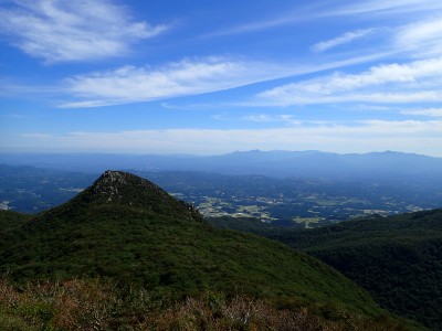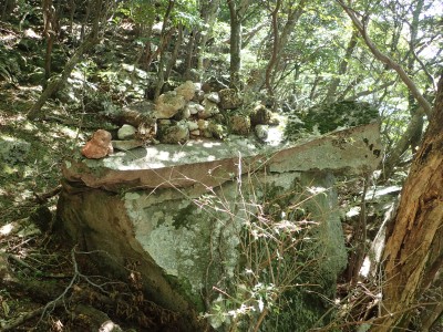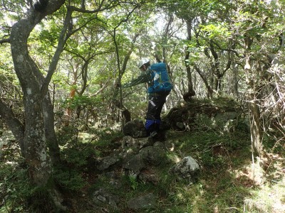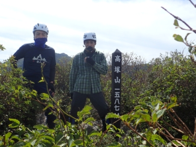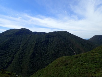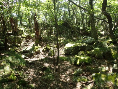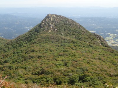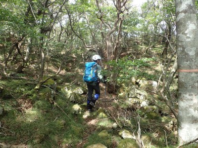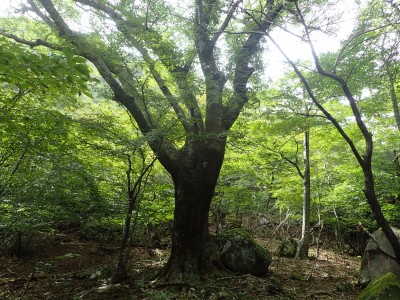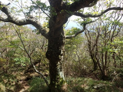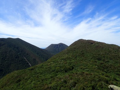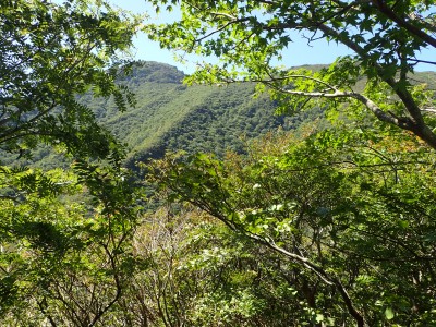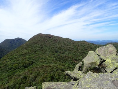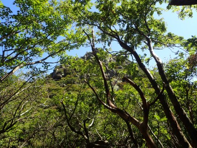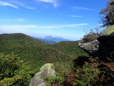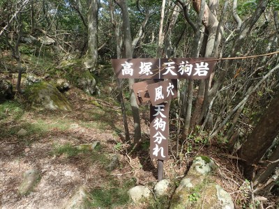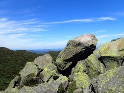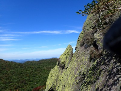 私たちは風穴で少々早いランチを済ませる。さあ出発しようとしたら先ほどの家族と思われる方達が無事に到着した。軽く会釈をして登り始める。ここからの急登はガレ場ザレ場なので落石に注意だ。それにしてもこの急登はきつい、こんなにきつかっただろうか、やはり体力が落ちているのだろう。後方のY氏は平然としている。ようやく天狗分れに着く。しばらく樹林の中を歩き巨石の積み上がった岩山をよじ登る。頂上からの展望はもちろん絶景だ。ここまで女子単独者に出合ったが降るときも女子単独者に出合う。黒岳と言う険しい山を若い女の子が一人で大丈夫なのだろうか・・・・。往路を天狗分れまで戻り、黒岳最高峰高塚山へと必死に登る。そう、もう必死だ。灌木の中、狭い山頂に立つとやはり絶景だ。先客は男性1名。とても静かな黒岳だ。