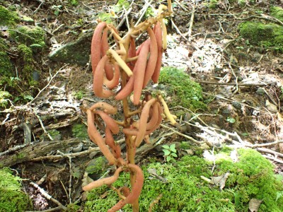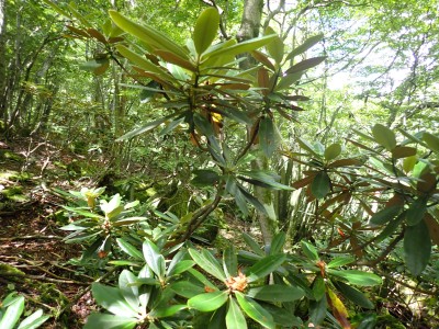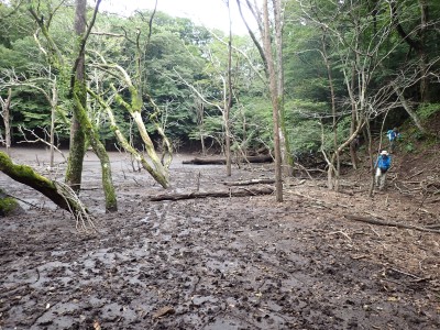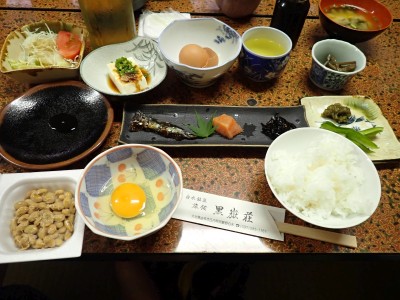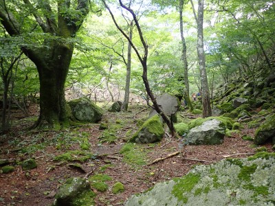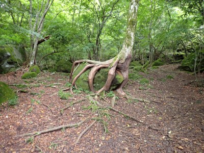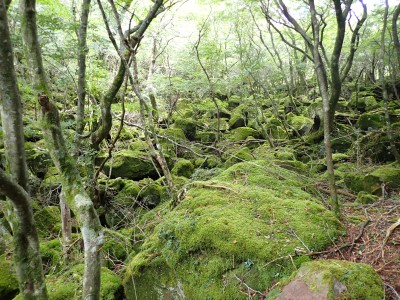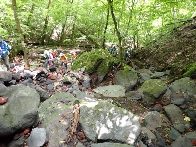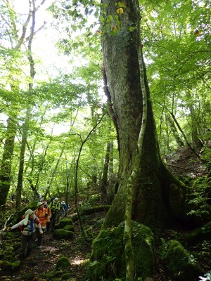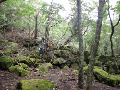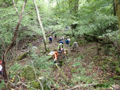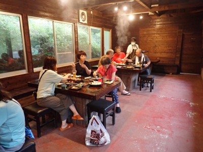 計画では黒岳の一つのピークである前岳を黒嶽荘から往復するはずであったが、四季菜ロードから黒岳に近づくにつれ黒い雲が、黒岳を覆っているのが見えてきた。さらに霧雨が降ってきたので男池の駐車場で車を降りて他のメンバに今回は「男池から風穴までにしないか」と提案する。反対者はなく、決定した。今日の目的はもちろん登山であるが、やはり一泊となると夜が楽しみである。従って歩ければどこでも良いのかもしれない。しかしながら今回のルート、侮ってはいけない。昔のように歩きやすい登山道は崩壊してゴロゴロとしたガレ場が続いたりソババッケは泥沼化し、真っ直ぐに渡れることができず、奧セリの先の石は濡れていて滑りやすく風穴までの石畳のような登山道もとても歩きにくくなっている。メンバーもずいぶんと高齢化も進んだので歩行速度は年々遅くなるようで風穴まで3時間半もかかってしまった。下山は多少早いとしても3時間近く必要だ。計算上、風穴に到着した時間はギリギリセーフ。風穴が初めてのメンバーに穴を覗き込んで冷風を体験してもらい、集合写真を撮ったら下山開始。それにしてもソババッケ〜風穴間で他の登山者に出合うことがなかったのは少々不思議である。下山は往路を戻る。雨が心配だったが、結局駐車場に着いて空を見ると峰々からガスが湧き上がって消えてゆきその先には青空が広がっていた。山から降りて疲れたはずだが、山荘でビールが飲めると思うとウキウキ気分だ。山荘に着くと交代で入浴し、持参したクーラーBOXの冷えたビールをいただく、そして楽しみの夕食。豪華な食事と宴会が始まる。幸いにも他の宿泊者がいなかったので誰にも迷惑をかけることはなかった・・・はず。翌日は、男池、旧豊後森機関車庫、道の駅と立ち寄り、無事集合場所で解散。この二日間、メンバーの協力で事故もなく楽しい山行となり本当に感謝である。そして山に自然にさらに山荘の方達に感謝!