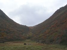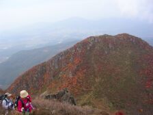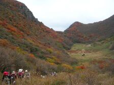 2006年10月22日(日)晴れ 「自然観察登山とボランティアの山の会」の10月の例会登山は「三俣山 お鉢巡り」ということで前回(9/3)に下見に行ったが、お鉢周りは初心者向きとは言えず危険な箇所も多いため、思案した結果、2つのチームにわけることにした。ということで@お鉢巡りA大鍋探索の2つのグループに分け、私はAの先頭をつとめることになった。 <今回のコース> 前回の下見と同コースのため詳細は省略します。 大鍋への入り口は標識がありません。南峰(標識上)への狭い上りの途中に雨ケ池への表示があります。ここより東に行くとすぐに北にお鉢の縁を下るように進みます。下りきると開けたところに出ます。西側には大鍋がみえます。ここに入り口がありますので下って行きます。林の中を抜けると急に開け、大鍋の底に着きます。不思議な世界です。周りは見事に紅葉していて思わず「オーッ」と声が出ていました。ここで私たちのグループは記念撮影です。ここまできつい思いをしてきたこともあり参加者の方の満足な表情が笑顔に現れています。(すみません勝手に掲載して・・・) ゆっくりとしたいところですが、時間に余裕がないため早々に本峰を目指します。入り口とは真反対に上り口があります。大きな岩が目印になるかと思います。踏み跡は割りとしっかりしています。北峰と本峰の鞍部に出て一旦休憩をし、本峰を目指します。本峰までは急登です。本峰でお鉢巡りのグループと合流し、下山しました。 帰りは温泉につかり、車中ではビールを飲み、俳句大会やビンゴゲームをして楽しく帰宅しました。 みなさん、お疲れ様でした。 |