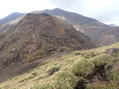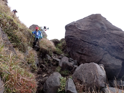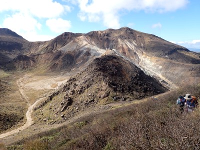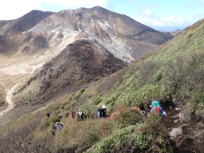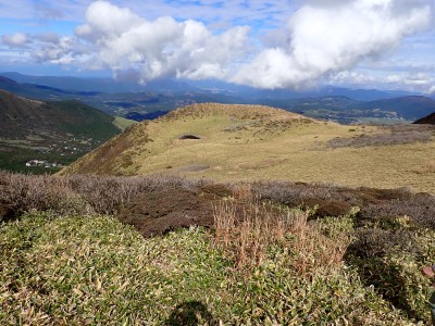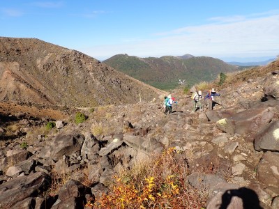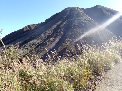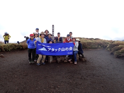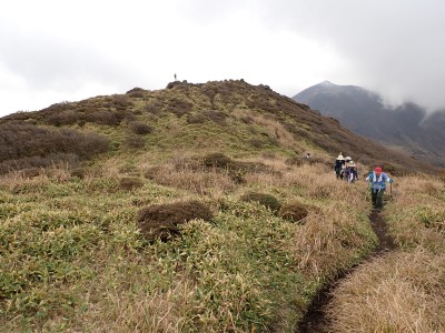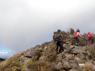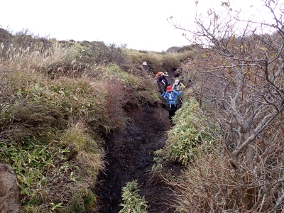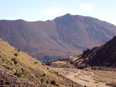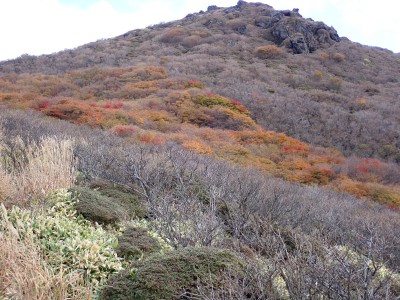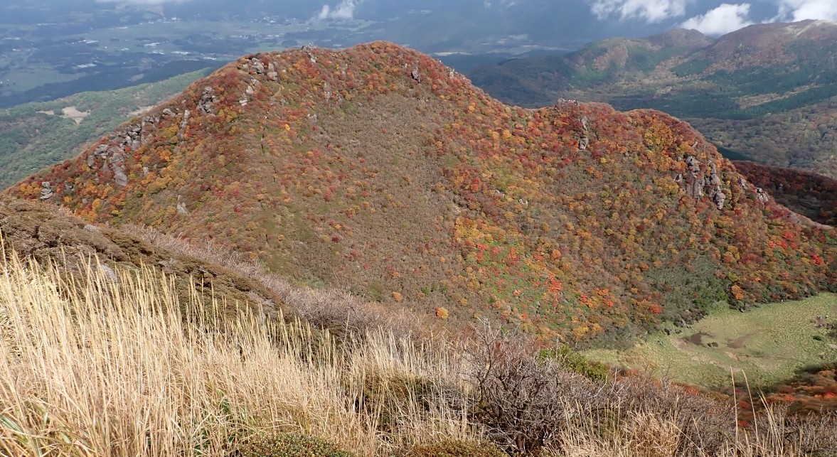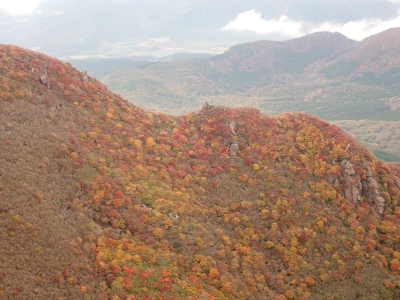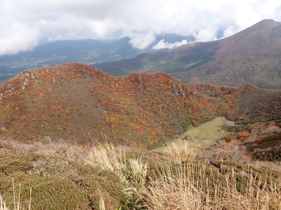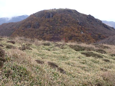 大曲で降ろしてもらい出発。天気予報は雨模様だったが、何と日頃の行いがよっぽど良かったのか、晴天の中スタートした。のんびりチームなので本当にのんびりと歩く。それでもすがもり越までのガレ場はきつい。そして西峰までは何度か息をつきながら頂上へ。トランシーバーで本日のCLのM氏率いるチームを呼ぶ。ちょうどすがもり小屋跡に到着したと言うので西峰頂上から大きく手を振る。いつもと違ってこれも面白い。本峰に着くと空は雲に覆われ、やや紅葉の輝きが失せてそれでも感動ものだ。先に昼食を摂っていると後続チームが到着。全くもって計画通りだ。集合写真を全員で撮り、我々のんびりチームは出発しようと思ったところ雲が切れてお鉢の紅葉に輝きを与えてくれた。おかげで記念の1枚が撮れた。下山は往路を戻る。すがもり越で休憩していると後続チームが見えてきた。先に出発したが、途中でポツポツを雨が落ちてきて雨具を着用。コンクリ−トの道に出ると後続チームと合流。そのまま我々も長者原までコンクリート道を歩くことにした。遠回りだが、登山道は泥濘んでいるようなので歩きやすい道を選んだ。無事駐車場に着くと車が少ないのには驚いた。今朝、大曲はびっしりと路肩に車が繋がっていたので長者原もてっきり混んでいると思った。やはりこの時期、三俣山は人気でしかも大曲からが短時間で登れるからであろう。今日は小雨のはずが、晴天となり、下山間近で雨が降り出すという不思議な日だった。素晴らしい紅葉と素晴らしい仲間、本当に感謝の日であった。特にCLを務めてくれたM氏には感謝である。