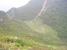 前ページの続き 四峰(標識上)山頂から来た道を戻り鞍部から本峰を目指します。なだらかな上りを10分程度行くと三俣山本峰山頂です。360度の展望を望むことができ北側に北峰、東側に南峰(標識上)が見えます。本峰から東側に進路をとり、南峰(標識上)を目指します。一旦急降下し、平坦な道となり、右手より急登を行きます。途中、雨ケ池への標識を(お鉢めぐりはこの道を行く)通り過ぎ三俣山本峰より約15分程度で南峰(標識上)山頂です。今回はちょうど正午を廻ったので食事を摂りました。 のんびりと昼食をし、いよいよお鉢を行きます。一旦、来た道を下り、「雨ケ池へ」の標識より東へ平坦な道を進みます。すぐに尾根の東側を北に向う狭い下り道となり大鍋・小鍋を回り込みます。ここまで来た人しか見れない小鍋を眺め満足感を得、崩落した崖を見てさらに回り込みます。ヤセ尾根で危険なケ所もあります。崩落した場所の横を這い上がり、大きな岩板をよじ登ると巨岩だらけの尾根に出ます。すぐに北峰です。南峰(標識上)より約1時間です。北峰山頂は巨岩だらけで狭い場所です。北側の下の方に「指山」が見えます。南には本峰が聳え立っています。記念撮影をして大鍋に降りるようにして下ります。下りきると小鍋のさらに小さい鍋(Yさん曰く「プチ鍋」)があったのでここで一息つき、本峰への急登を行きます。20分程度喘ぐと三俣山本峰山頂です。ここからの帰路は往路をとります。約90分で大曲り登山口です。 コースタイム 大曲登山口−(60分)−すがもり越−(20分)三俣山西峰東端−(30分)四峰−(10分)−三俣山本峰山頂−(15分)南峰山頂−(60分)−北峰山頂−(15分)−三俣山本峰−(40分)−すがもり越−(50分)−大曲登山口 ※休憩は含んでいません。あくまでも参考タイムです。 休憩含んで約7時間のコースです。 ※山頂標識に「四峰」と「南峰」とありますが、地図上では「四峰」を「南峰」、「南峰」を「東峰」とした方がわかりやすいのではないかと思います。実際、ガイドによって表記が違います。 |