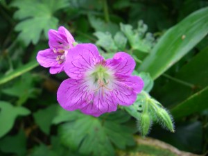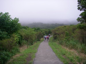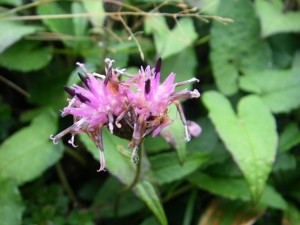 | 登山口からしばらくコンクリートの道 | 展望台だが、ガスで展望なし | 瑞々しく咲いていたフウロ |