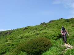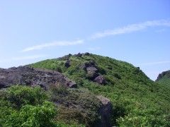 | 前ページからの続き 立中山から鉾立峠まで戻り、今度は白口岳を目指します。標高差は約350m。直登を一気に行くわけですが、今日のこの暑さで休憩しながら歩いたために60分ほど時間を要しました。山頂は風が心地よく360度のパノラマです。遠くに阿蘇も見えます。ここで昼食を済ませ、西側へと降ります。目の前に稲星山を見ながら右手に鳴子山を見ながら火口縁を歩く感じで稲星山と沢水との分かれ稲星越に着きます。ここから標識にはないのですが、東側の尾根を踏み跡を頼りに進みます。巨岩の多い尾根です。しばらくなだらかな下りを行くと急斜面の降りとなり、目の前に鳴子山が見えてきます。ひとのぼりで山頂です。ここも360度の眺望です。展望を楽しんで山頂の最北端に踏み跡があるのでここから下山します。滑りやすいので注意です。踏み跡のとおり進んで行くと途中で右手へと林の中に入り込んで行きます。赤テープがありますが、すぐに崩落した場所に出ます。少々危険です。慎重に降ります。石の多い下りから林の中の細い道となり、ようやくまともな登山道となって水場で一息ついて杉林を抜け河原を横断して道なりにとにかく進むと林道に出ます。林道が砂利道から舗装道となれば沢水展望台が見えてきます。 <参考コースタイム> 沢水展望台登山口-(25分)-くたみ分かれ-(50分)-鍋割峠-(40分)-鉾立峠-(20分)-立中山-(20分)-鉾立峠-(60分)-白口岳-(15分)-稲星越-(30分)-鳴子山-(35分)-分岐-(90分)-沢水展望台登山口 ※休憩時間は含まれておりません。全行程で約7.5時間でした。 <感想> 鉾立峠から白口岳への直登は、何時行ってもきついコースです。今回初めて歩いた鳴子山までの尾根は素晴らしいコースでした。鳴子山から崩落した下山道は、落石しやすく、とても危険ですので団体での山行はやめた方が良いと思いました。 |
