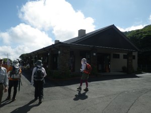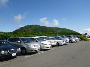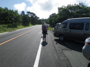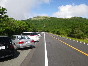 | 牧ノ戸登山口まで車道歩き | 牧ノ戸峠P(後ろは黒岩山) | 多くの登山者で混雑(8:55) |